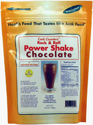 Chocolate Flavor. Dixie Carb Counters Rock 'n Roll Power Shakes are high protein (18g to 21g) and give you instant soda fountain flavors with just cold water and ice! Use a Shaker Jar (or a tight fitting 16 oz. minimum size jar and lid) and shake. Instant creamy and delicious flavor tastes like melted ice cream in a thick and frothy wave. If you like shakes on the go - you will agree that these are the top of the heap in flavor and convenience. Enjoy at work, home, wherever you want a quick and easy high protein energy break. Contains 7 individual travel packs - just mix and enjoy. See label for "latte" suggestions and blender alternatives. Just 2 net carbs. Nutrition Facts: Serving size 1 packet (34g), Servings per container 7, Calories 111, Calories from Fat 15, Total fat 2g, Saturated Fat 1g, Trans Fat 0, Cholesterol 37mg, Sodium 249mg, Total Carbs 4g, Dietary Fiber 2g, Sugars 0g, Sugar Alcohols 0g, Protein 21g. Readmore .. .